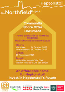 Ideally we need to raise £164,000 in community shares. This would be in addition to a £90,000 grant we have applied for from Calderdale Council’s ring-fenced Affordable Housing Fund, we are expecting a decision in mid November..