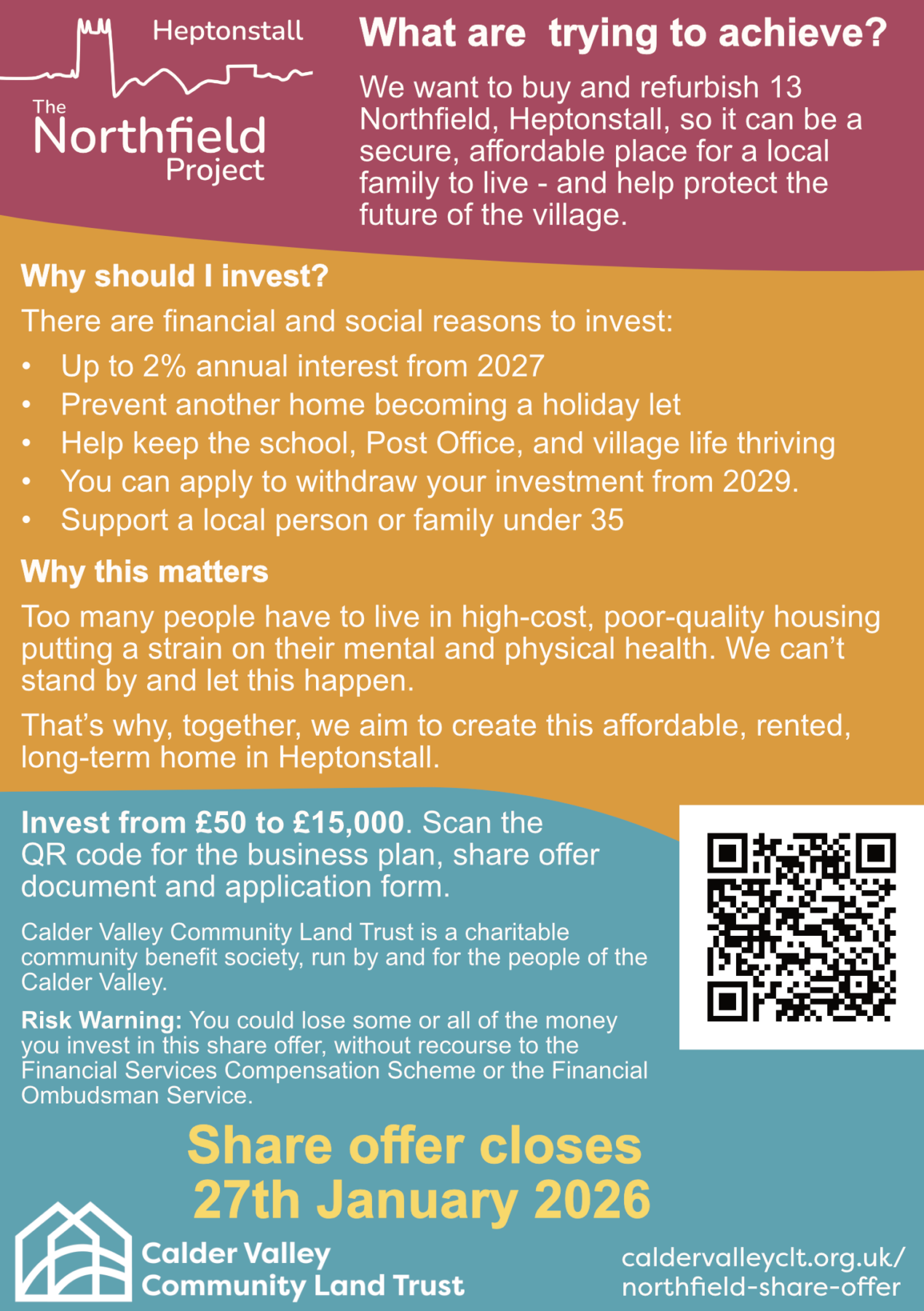 If you invest in shares as part of this share offer, you will hold shares in the Calder Valley Community Land Trust (CVCLT) as a whole. We have therefore provided information below and in our business plan for both CVCLT as a whole as well as this particular project. Our 2025 Review gives an overview of the Society and what we do.